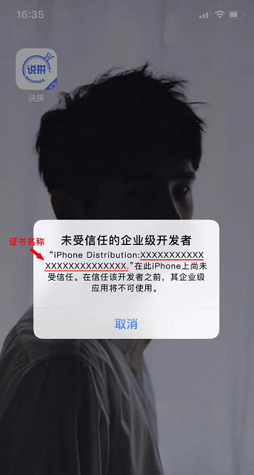 1. 点击安装好的APP,以【说拼】为例,点击【说拼】图标,查看证书名称。记住红线部分名称。